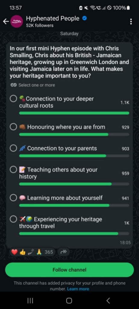 Caso real: A organização Hyphenated People atraiu mais de 50.000 seguidores em dois meses usando um canal no WhatsApp.